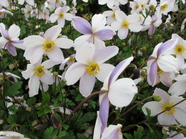 Anemone japonica Elfin Swan is a beautiful Japanese Anemone in high demand. A hardy perennial forming a clump of of attractive foliage that produces masses of beautiful white cup shaped flowers with bands of lilac-blue on the backs of the petals.