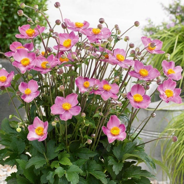Japanese Anemones are easy to grow, trouble free plants – Fantasy Cinderella is a compact, well-behaved beauty, slug and snail resistant, not fussy on soil conditions, it will thrive planted in full sun or partial shade. Forming a nice clump that increases and improves year on year, the masses of pink flowers shown off beautifully above the fresh green foliage.