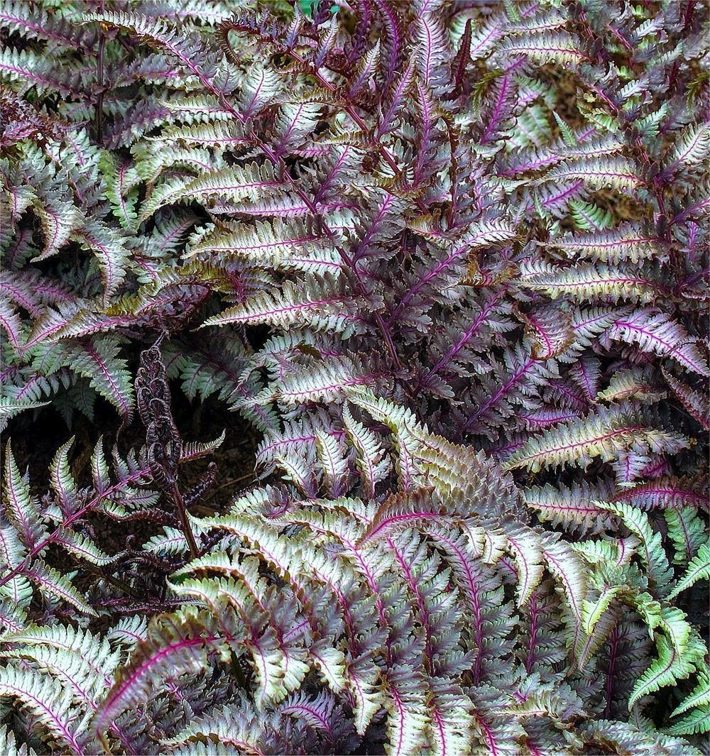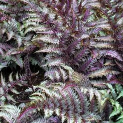 One of the most colourful ferns for the garden, Athyrium niponicum pictum metallicum, or as it is better known the ‘Japanese Painted Fern’ has silvery-grey fronds which are dusty purple towards the center. They are set off by beautiful purplish-red veins and stems. This has to be one of the most unusual, elegant looking and desirable deciduous ferns available.