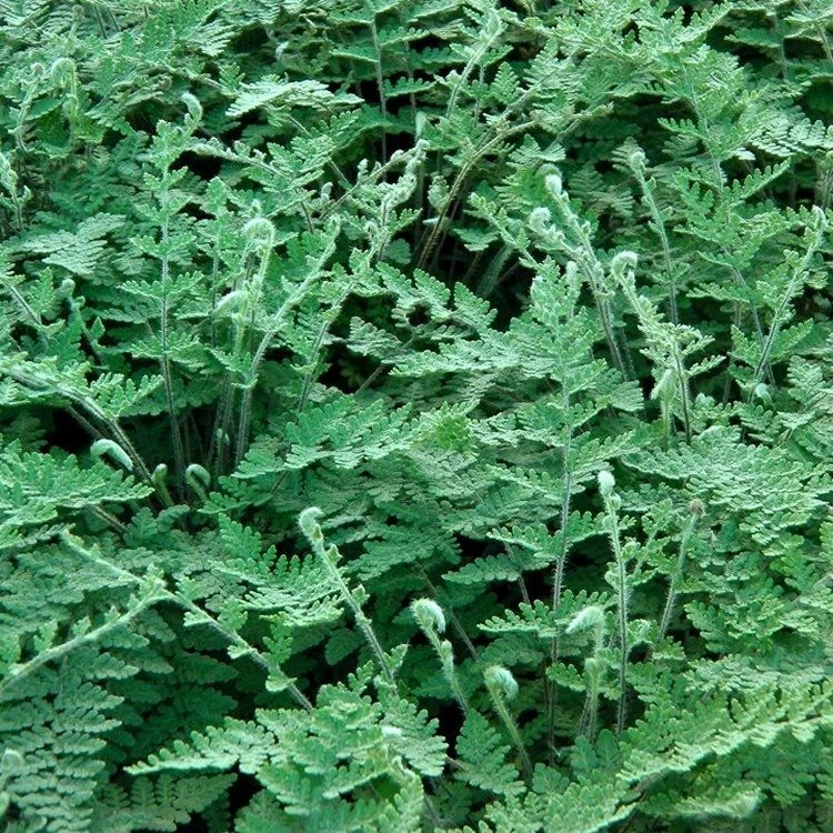 The Cheilanthes Lanosa is a lovely fern with soft foliage of silver-grey-green colouration. Shade-loving, unlike many ferns this variety prefers a loose, gritty rock garden type situation and will even thrive in partial or full sun. It forms a low, tufted clump of finely divided fronds, covered on both sides with soft downy hairs which give the silvery-grey look. Native to the Southwestern US, this will handle hot, dry summers, with its roots cool down among the rocks.