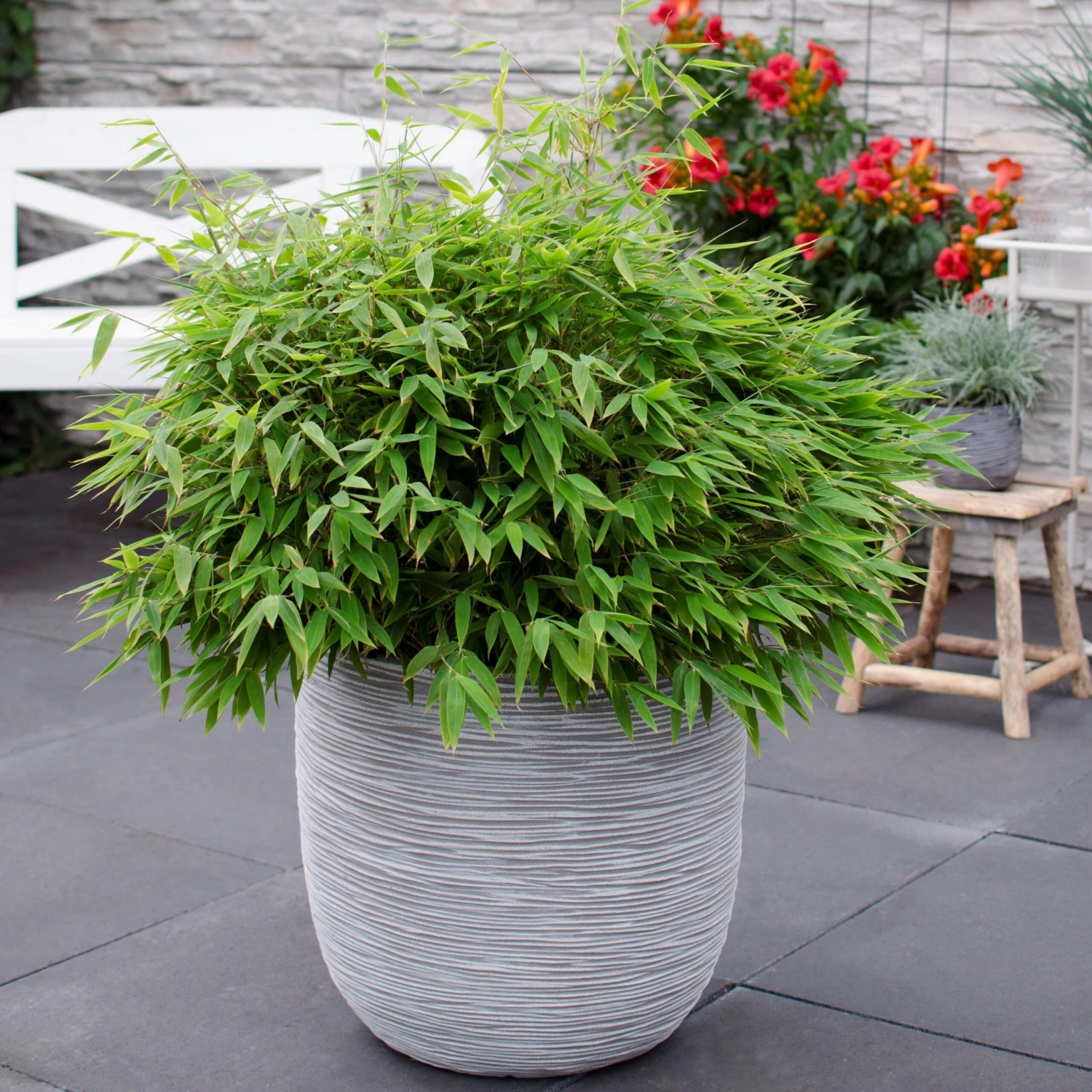 Fargesia murieliae Moontears is a fantastic new variety of compact clumping bamboo, tough and fully winter hardy, it’s bred in Germany, and nicknamed ‘Boobux’ thanks to forming relaxed ball shaped plants with a little clipping – reminiscent of a topiary buxus ball – except with more relaxed form and texture being bamboo!