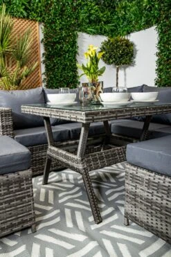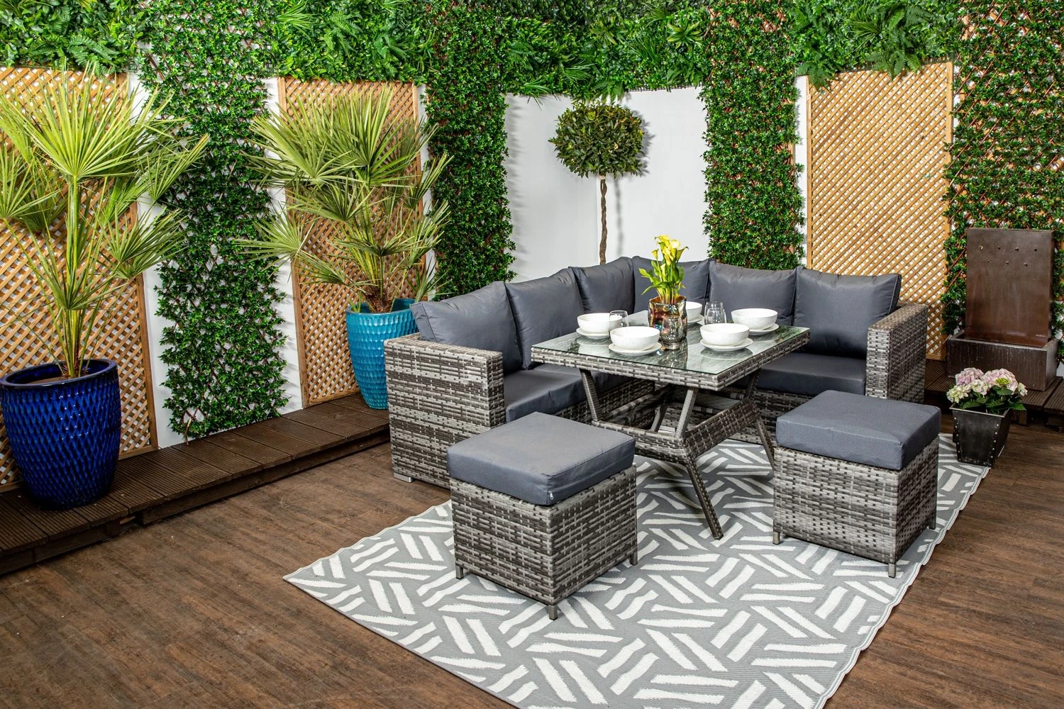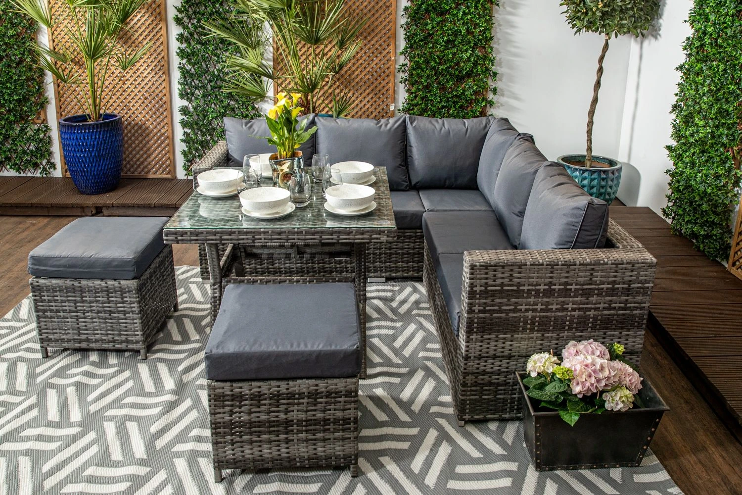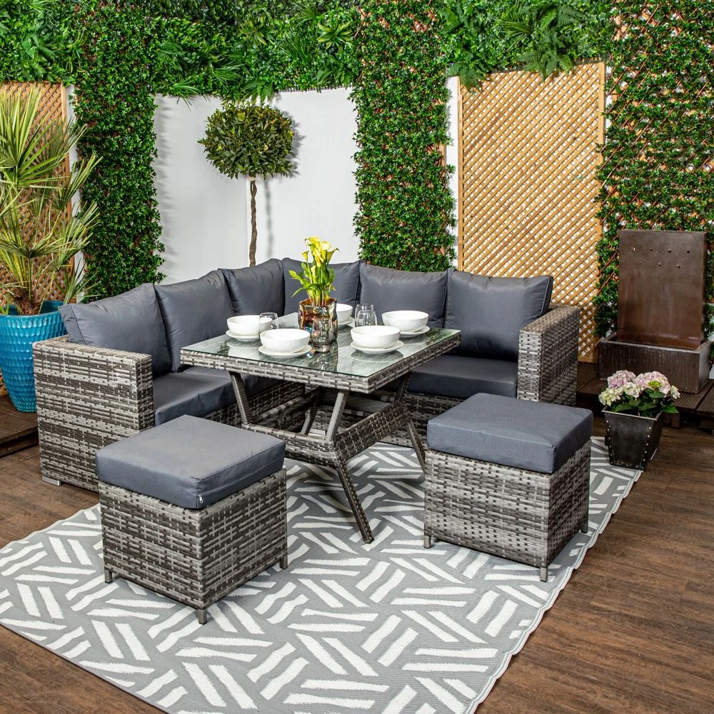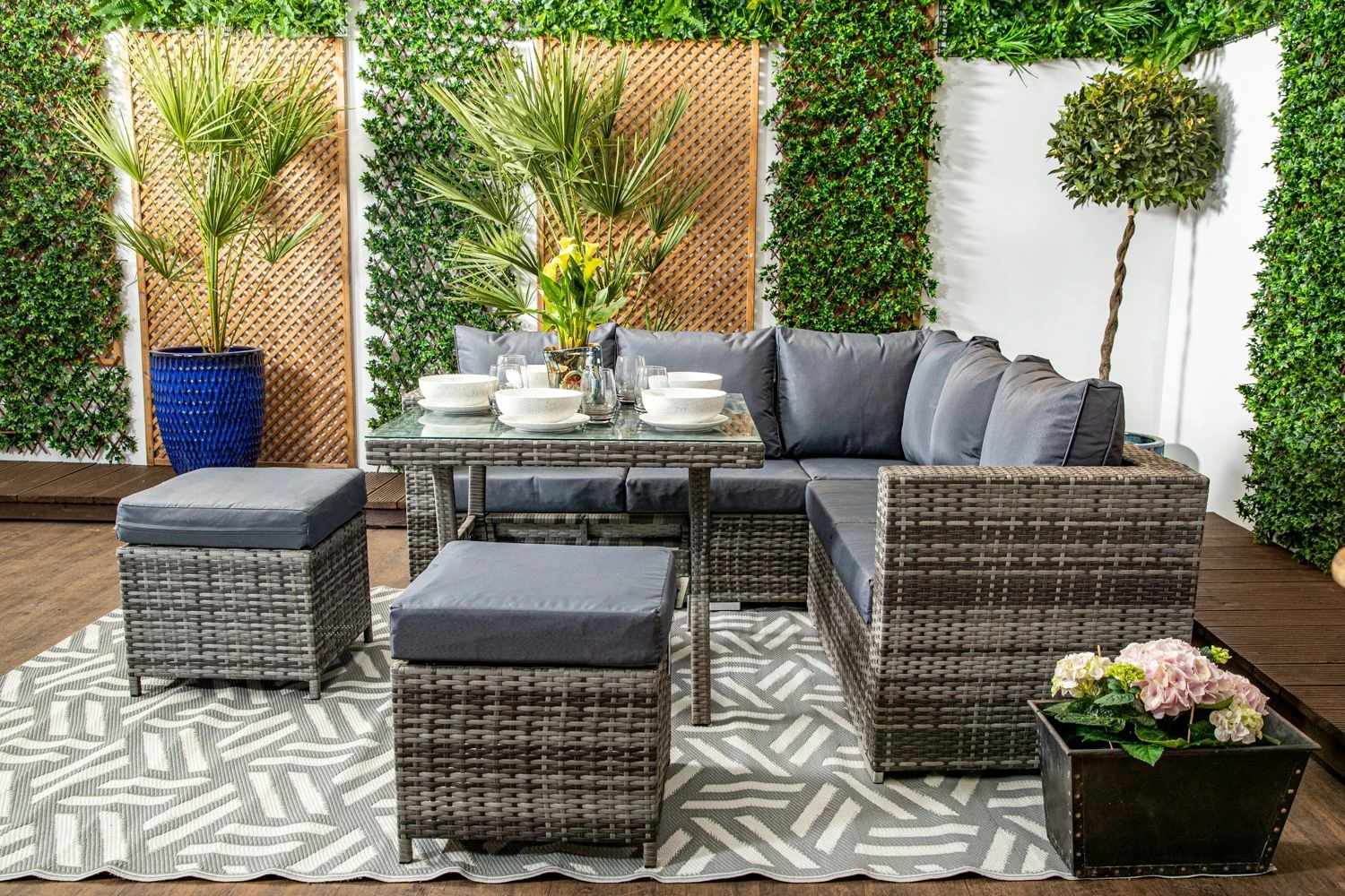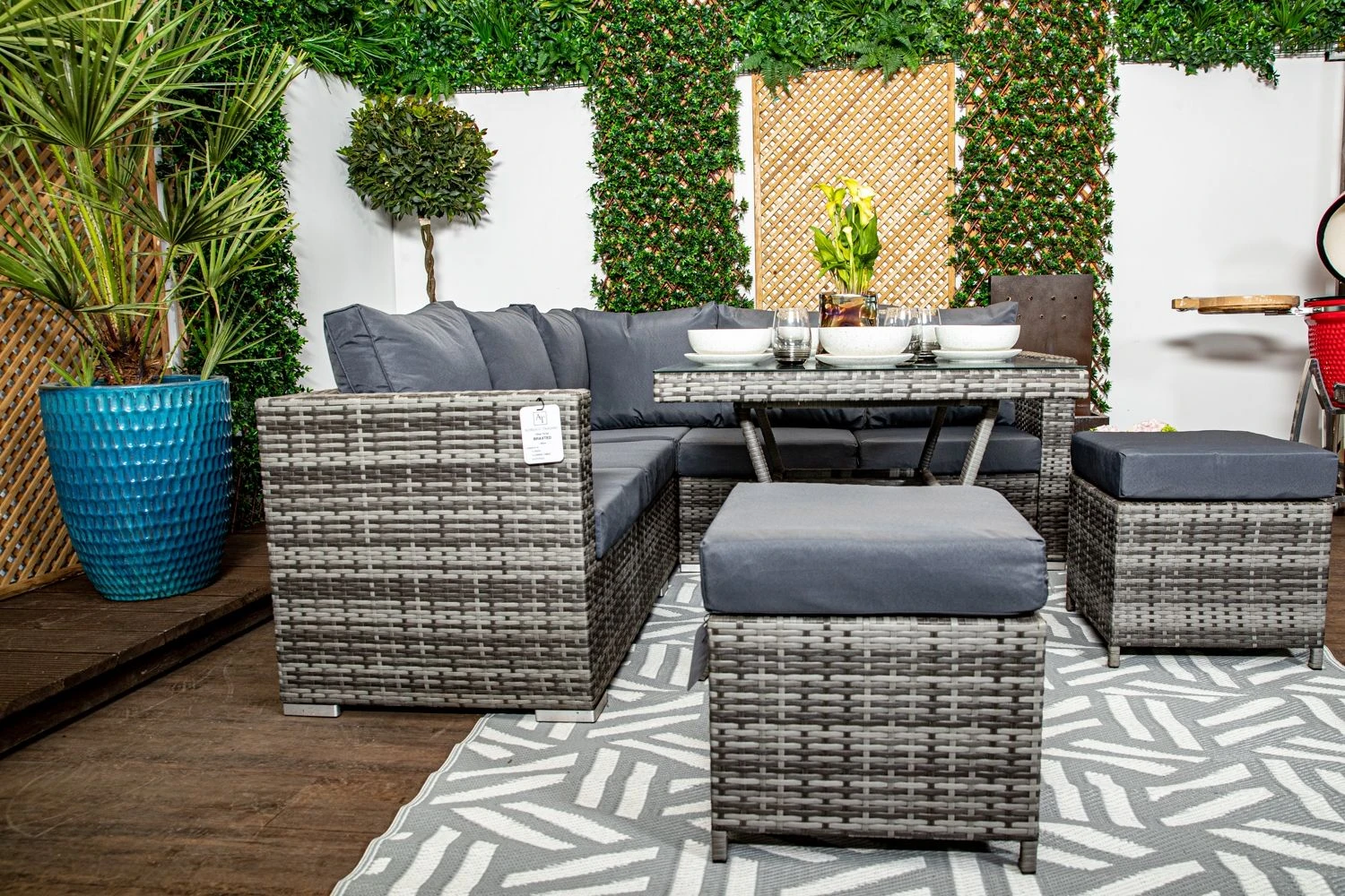 No matter how big your garden may be, at Alfresco, we have furniture to suit all shapes and sizes. Allowing for up to 6 guests with 2 footstools doubling up as extra seating, this beautiful Compact Corner Sofa Set with Dining Table is the ideal option for those cosier outdoor spaces.