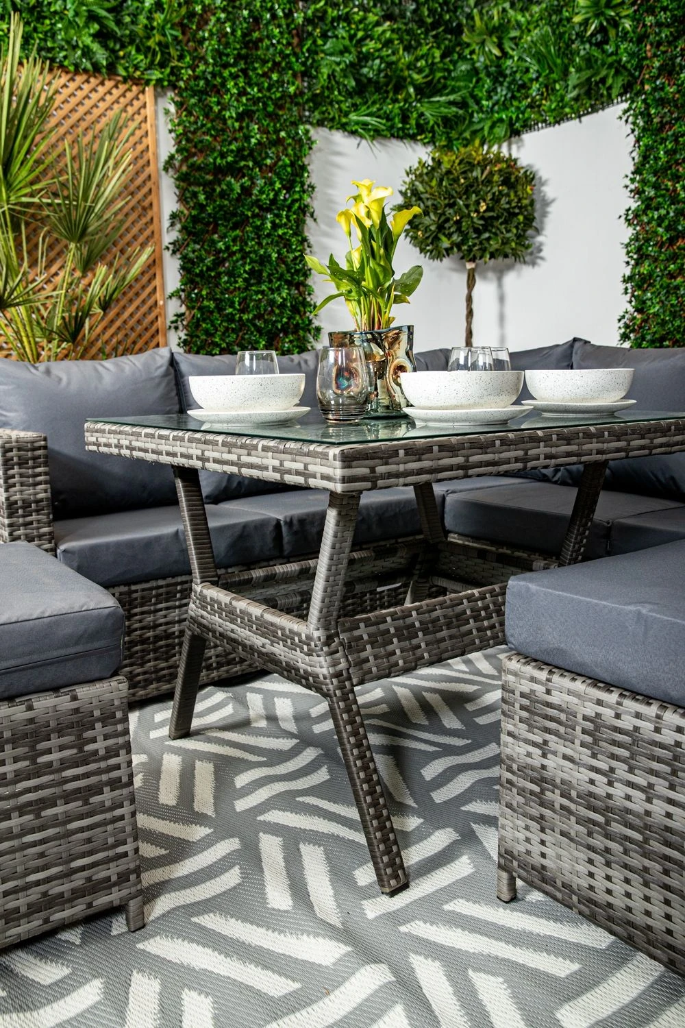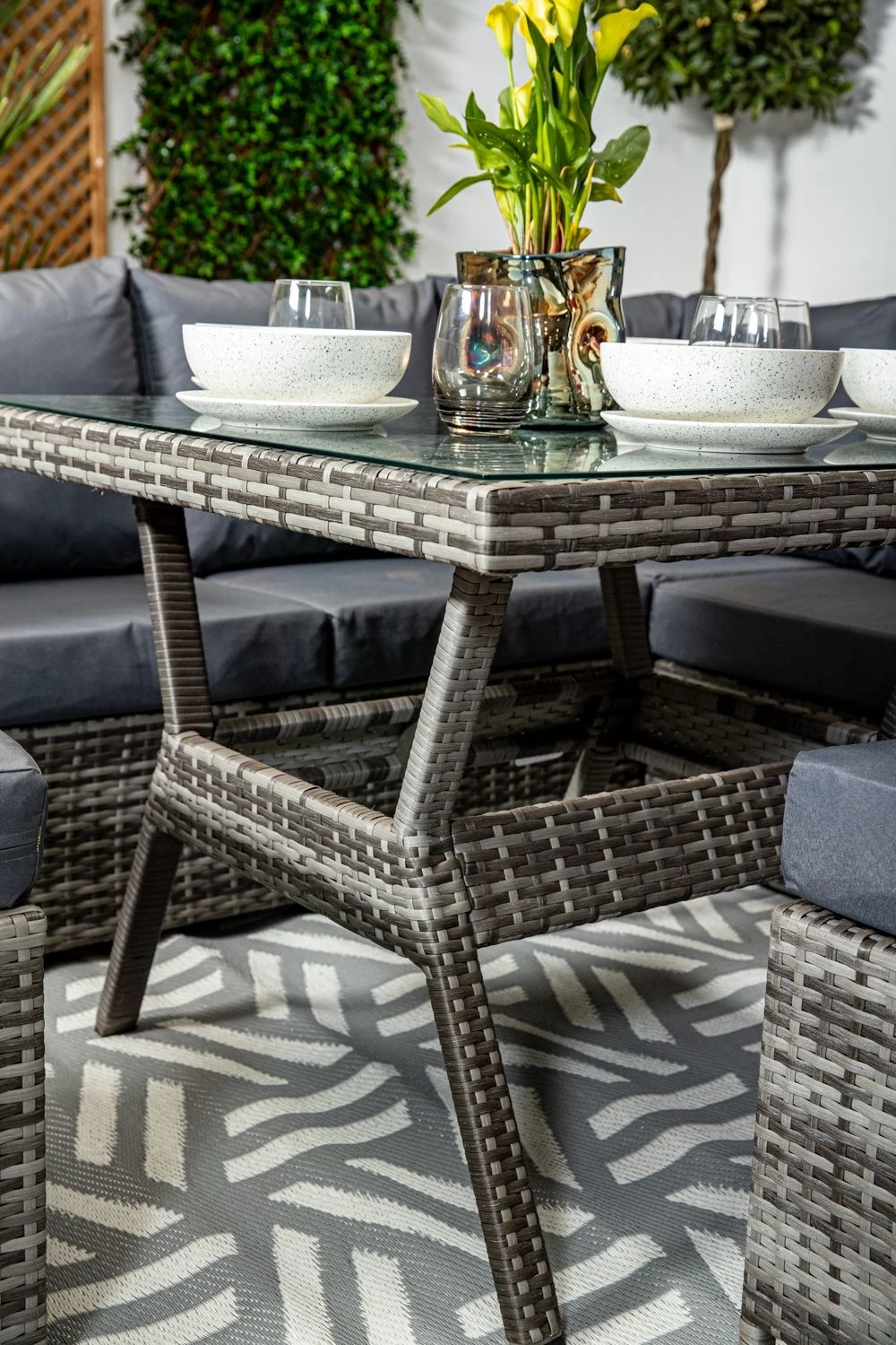 Compact Grey Rattan Corner Sofa Set with Glass Topped Dining Table, Two Stools & Anthracite Cushions