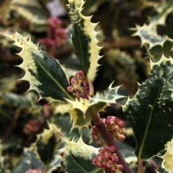 Genuine hedgehog holly, with nasty prickles on every leaf – quite possibly burglar proof. The shiny leaves have a creamy white edge and spines not only on the leaf margins but also on the leaf surface. This will create a very dense, prickly evergreen hedge, which is shade tolerant, retaining the bright variegation even in the shade. It also looks great on its own at the back of the border. A male variety, so perfect to please the lady hollies and ensure plentiful berries on those varieties. Supplied in approx 7.5 litre containers.