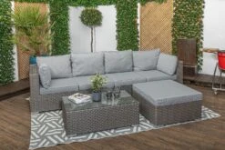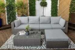 Monte Carlo – High Back Rattan Garden Furniture Sofa Set with Coffee Table, Grey Cushions and Stool
