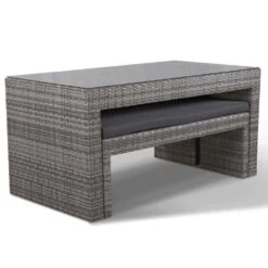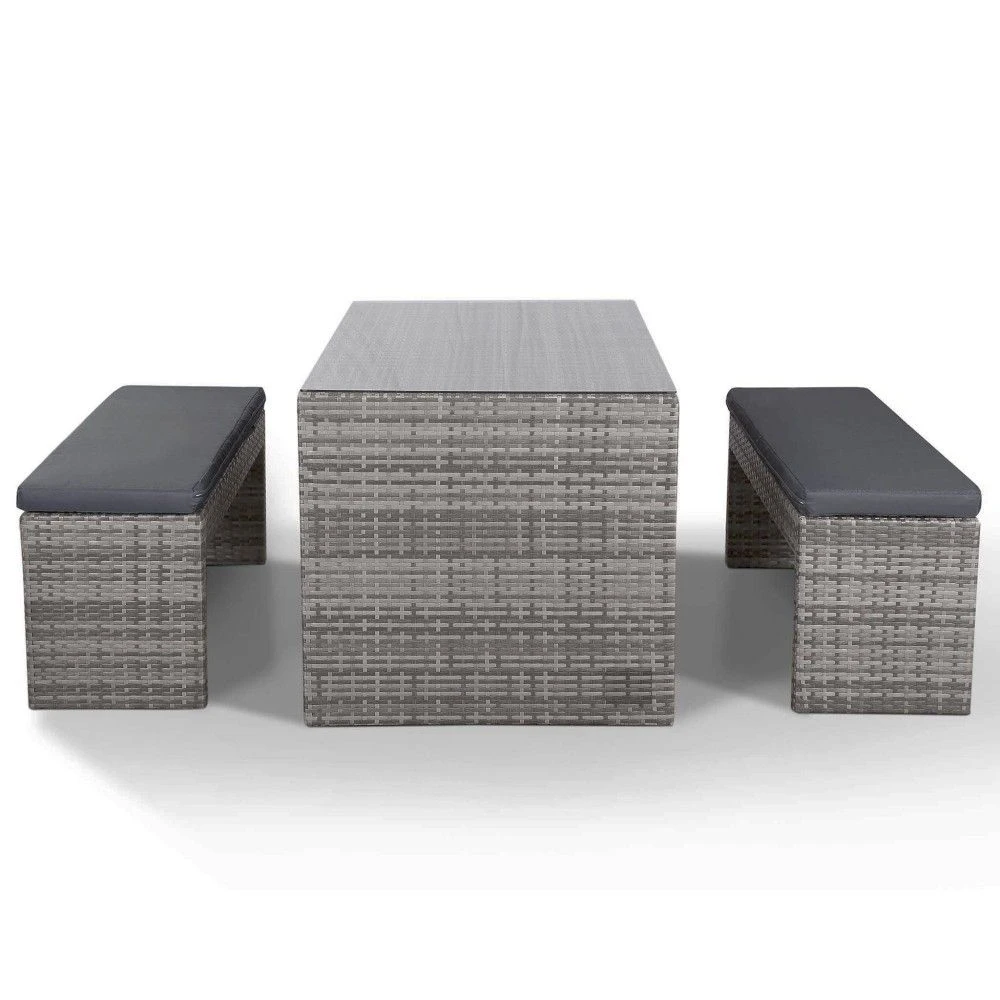 Glass Topped Luxury Grey Rattan Picnic Table with Two Benches & Cushions