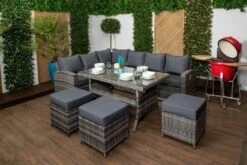 Any outdoor space would be complemented by this contemporary, High Back Corner Sofa Set with Dining Table- which is the perfect piece for both entertaining and relaxing. Intertwined with neutral toned rattan, this stylish dining set comfortably seats 6, but with 3 footstools doubling up as extra seating, it can accommodate up to 9 guests.
