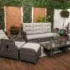 Grey Rattan Casual Dining Sofa Set – High Backed with Dining Table, Three Stools and Cushions included