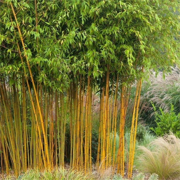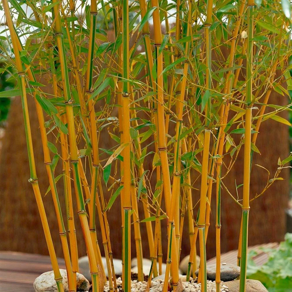 A tall, coloured-stemmed bamboo with rich yellow canes with a few green stripes at the base. This green leaved bamboo looks spectacular grown as a specimen. This colourful variety looks great alongside the ebony-black canes of the black bamboo, Phyllostachys nigra. This aptly-named bamboo is highly recommended.