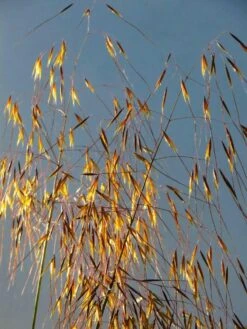 Arching stems of glistening, golden, oat-like flowerheads appear above clumps of slender, grey-green leaves. This majestic semi-evergreen grass is an excellent specimen plant for a sunny, mixed or new perennial border. The leaves are strong and thin, and it displays a wonderful plume of oat-like flowers that emerge purple and mature to a golden yellow by autumn, making it the perfect choice for introducing movement, it looks stunning under-planted with the rich purple Alliums and a host of other plants such as Sedum, Heleniums, Echinacea and more. It will thrive in fertile well-drained soil ideally in a sunny position.
