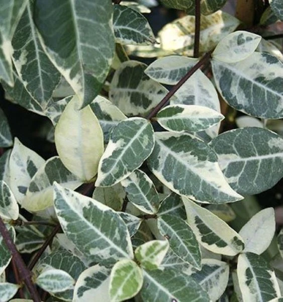 A very fragrant rarer form of the popular evergreen climber, producing clusters of 25mm white flowers in mid-summer. The striking creamy yellow variegation makes a vivid contrast to the green centres. Plant in a south facing position for best results. Supplied in approx 2-3 litre containers.